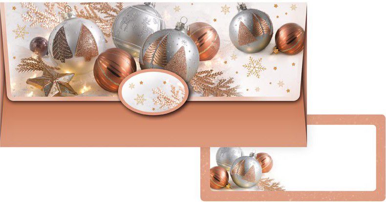 Dárková obálka na peníze s motivem vánočních ozdob a uzavíratelnou klopou.