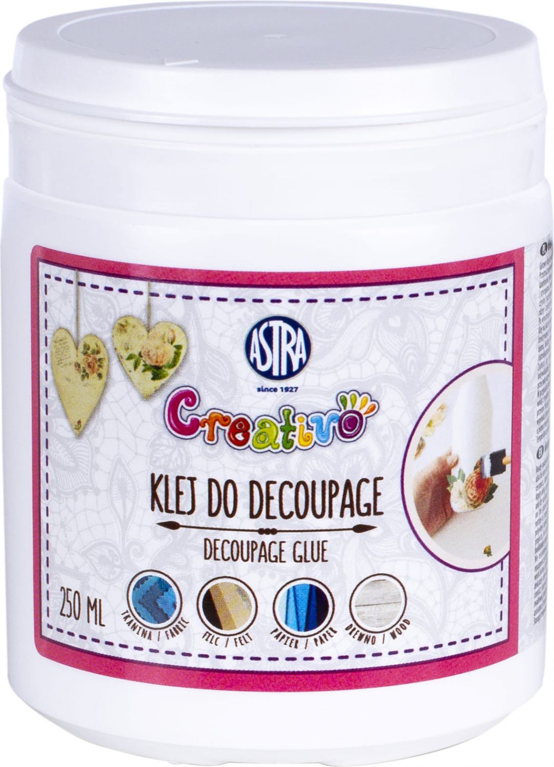 Univezální lepidlo ASTRA na decoupage je viskózní lepidlo vhodné na všechny ubrouskové techniky a také na papír, dřevo, korek, keramiku, textil, alobal a polystyren.