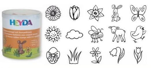 Razítkovací set v plastové dóze - jarní tématika, s razítkovacím polštářkem