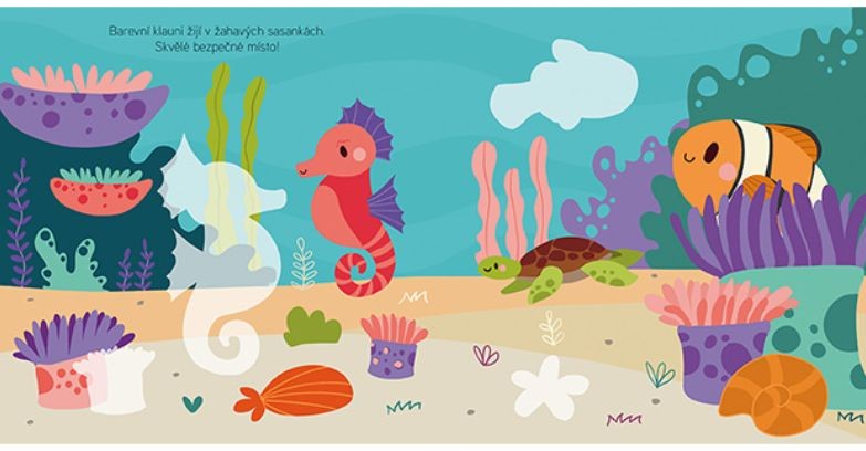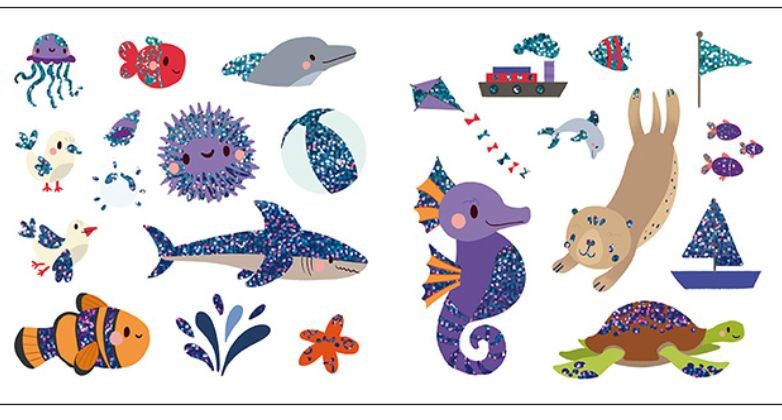 Samolepková knížka malého formátu obsahuje 16 stran a 4 listy samolepek z mořského světa, z nichž některé mají metalický efekt.