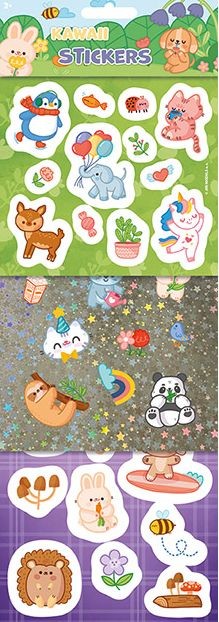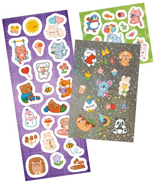 Set obsahuje list klasických papírových samolepek, list samolepek s fóliovým efektem a list samolepek s barevnými glitry.