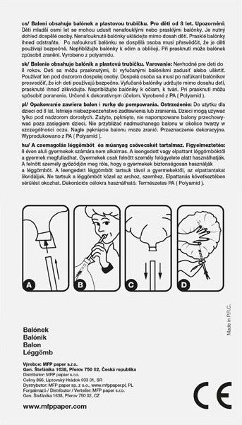 VAROVÁNÍ: Vhodné pro děti od 8 let. Děti se mohou prasklými či vyfouknutými balónky zadusit nebo uškrtit. Používejte pouze pod dozorem dospělé osoby. Dospělá osoba se po nafouknutí balónku musí přesvědčit, že jej děti používají bezpečně. Vyfouklé balónky udržujte mimo dosah dětí a prasklé ihned zlikvidujte. K nafukování balónků použijte pumpičku. Nepřibližujte balónky k očím a obličeji. Při prasknutí může balónek způsobit zranění. Vyrobeno z přírodního kaučuku, latexu. Určeno k dekorativním účelům.