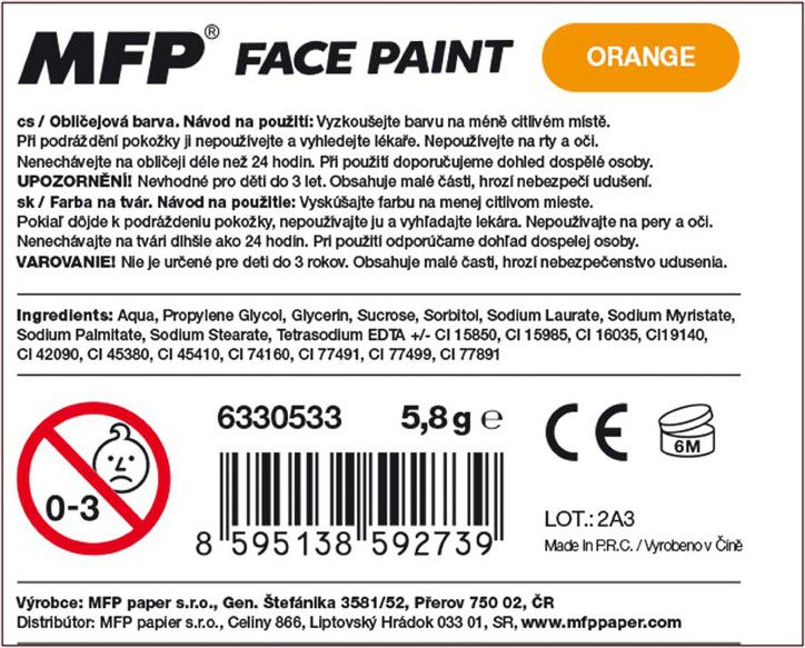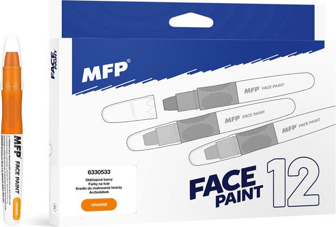 Barva na obličej oranžová, na principu rtěnky (6 g). Díky těmto pestrým barvám vykouzlíte na tváři dítěte krásnou masku na karneval, párty nebo jinou oslavu. Dermatologicky testováno. Barva: oranžová NÁVOD NA POUŽITÍ: 1. Doporučujeme vyzkoušet barvičky na méně citlivém místě. 2. Dojde-li k podráždění pokožky, nepoužívejte a vyhledejte lékaře. 3. Nepoužívejte na rty a oči. 4. Barvičkami malujeme na suchou pokožku. 5. Jednoduše omyvatelné vodou a mýdlem, barvy zdravotně nezávadné. 6. Nedoporučujeme nechávat na obličeji déle než 24 hodin. 7. Při použití doporučujeme dohled dospělé osoby. VAROVÁNÍ: Nevhodné pro děti do 3 let, nebezpečí spolknutí malých částí. Všech 12 ks je baleno v papírové krabičce. Uvedená cena je za 1 ks.