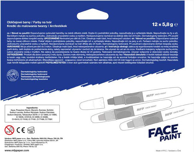 Barva na obličej světle zelená, na principu rtěnky (6 g). Díky těmto pestrým barvám vykouzlíte na tváři dítěte krásnou masku na karneval, párty nebo jinou oslavu. Dermatologicky testováno. Barva: světle zelená NÁVOD NA POUŽITÍ: 1. Doporučujeme vyzkoušet barvičky na méně citlivém místě. 2. Dojde-li k podráždění pokožky, nepoužívejte a vyhledejte lékaře. 3. Nepoužívejte na rty a oči. 4. Barvičkami malujeme na suchou pokožku. 5. Jednoduše omyvatelné vodou a mýdlem, barvy zdravotně nezávadné. 6. Nedoporučujeme nechávat na obličeji déle než 24 hodin. 7. Při použití doporučujeme dohled dospělé osoby. VAROVÁNÍ: Nevhodné pro děti do 3 let, nebezpečí spolknutí malých částí. Všech 12 ks je baleno v papírové krabičce. Uvedená cena je za 1 ks.