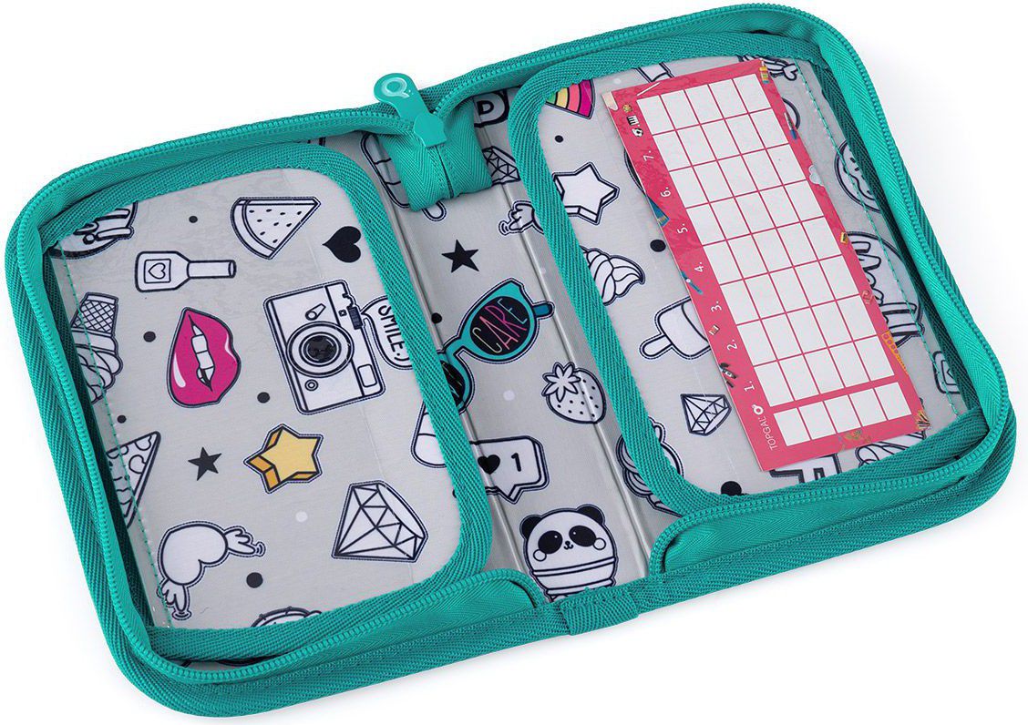 Jednopatrové školní pouzdro se dvěma klopami. Díky gumovým úchytům se do nich vejde celkem dvacetjedna pastelek, tužek a fixek. Tři širší úchyty poslouží na pravítko, kružítko či nůžky. Dva větší na gumu a ořezávátko.
