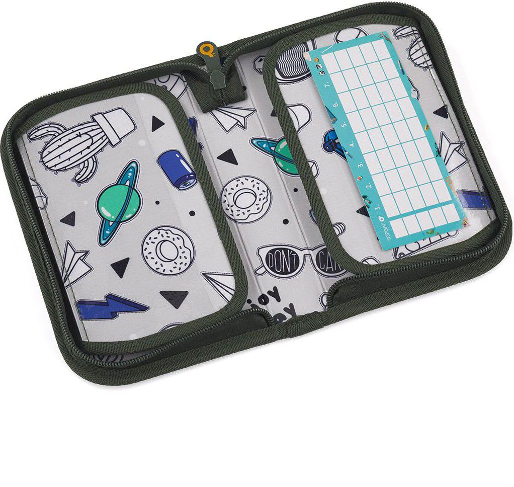 Jednopatrové školní pouzdro se dvěma klopami. Díky gumovým úchytům se do nich vejde celkem dvacetjedna pastelek, tužek a fixek. Tři širší úchyty poslouží na pravítko, kružítko či nůžky. Dva větší na gumu a ořezávátko.