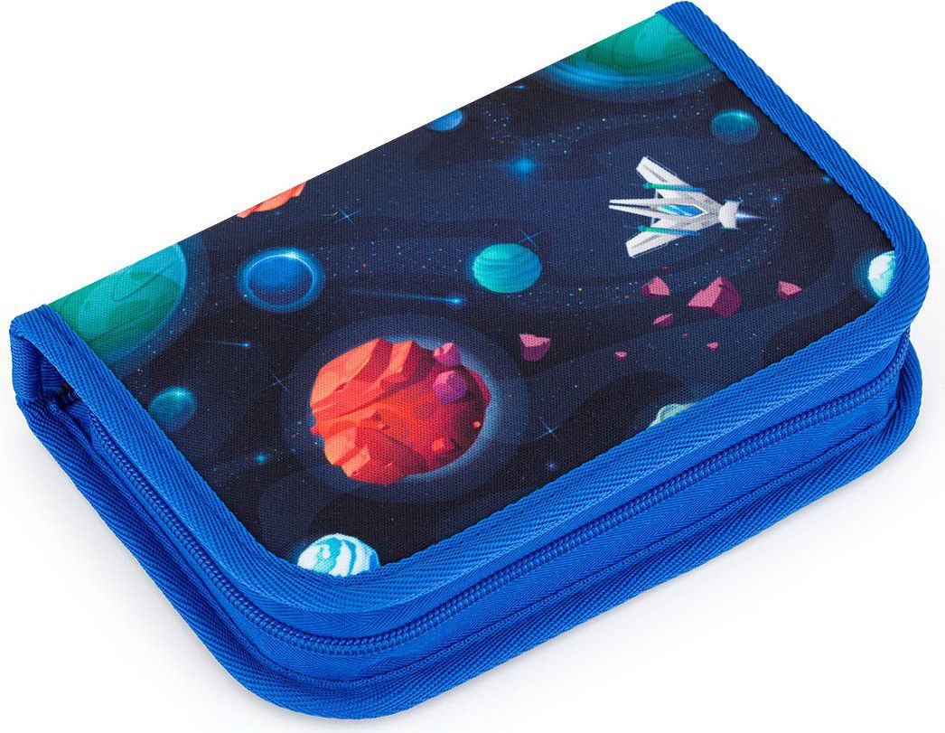 Jednopatrové školní pouzdro se dvěma klopami. Díky gumovým úchytům se do nich vejde celkem dvacetjedna pastelek, tužek a fixek. Tři širší úchyty poslouží na pravítko, kružítko či nůžky. Dva větší na gumu a ořezávátko.