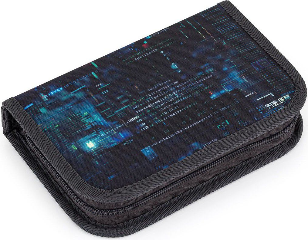 Jednopatrové školní pouzdro se dvěma klopami. Díky gumovým úchytům se do nich vejde celkem dvacetjedna pastelek, tužek a fixek. Tři širší úchyty poslouží na pravítko, kružítko či nůžky. Dva větší na gumu a ořezávátko.