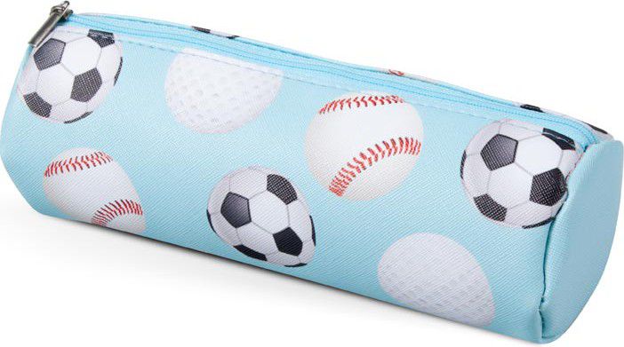 Modrá válcová etue s motivem sportovních míčů je ideální pro všechny, kteří milují pohyb a hravý design.