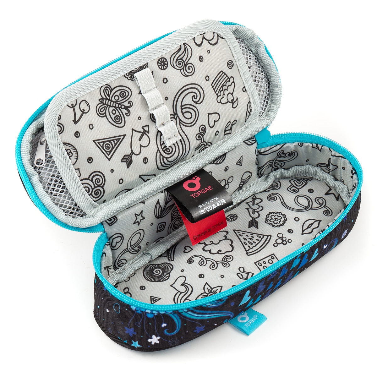 Oválný penál pro všechny potřebnosti ocení spíše starší školáci. Uvnitř pouzdra je síťová kapsička na zip a klopa, na níž jsou umístěny gumičky pro uchycení celkem devíti tužek a propisek, které je potřeba mít přehledně uspořádané a vždy po ruce. Prostor pod klopou pak umožňuje volně umístit další psací potřeby – pastelky, fixy, prostě cokoliv potřebujete.