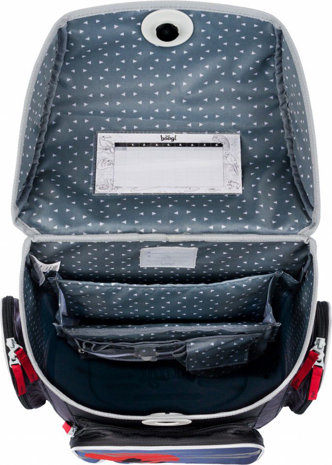 Uvnitř aktovky je průhledná kapsa s rozvrhem a vnitřní organizér umožňující rovnoměrné rozložení hmotnosti.