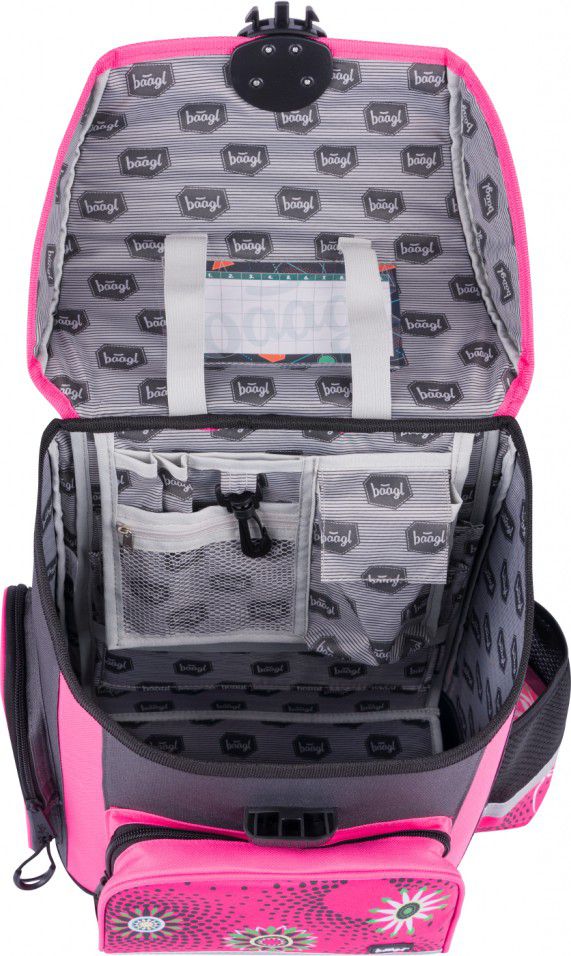 Uvnitř aktovky je průhledná kapsa s rozvrhem a vnitřní organizér umožňující rovnoměrné rozložení hmotnosti.