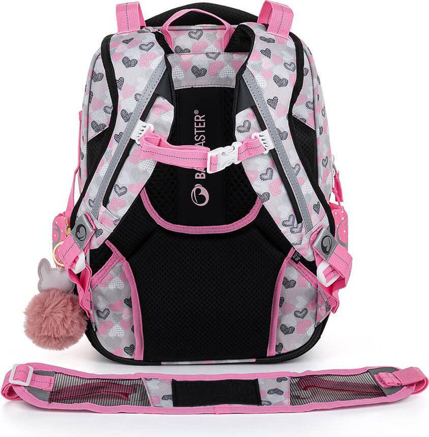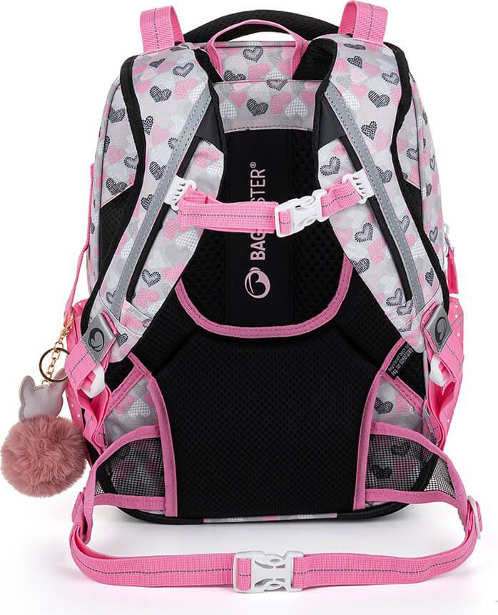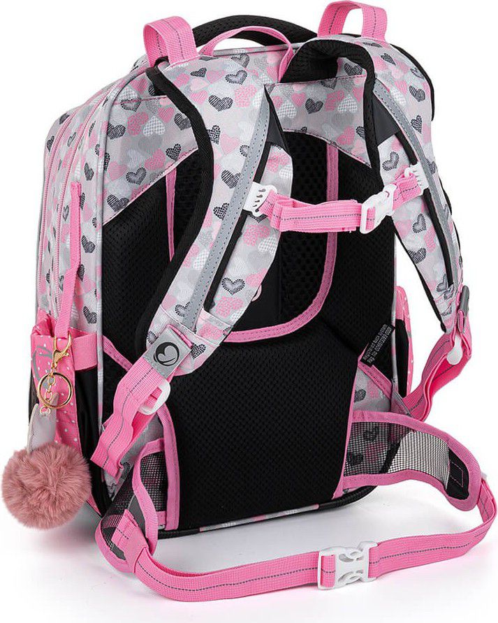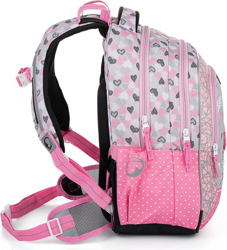 Ramenní popruhy jsou anatomicky tvarované a měkce polstrované. Popruhy je možné individuálně nastavit dle velikosti vašeho školáka, a to pomocí dolních plastových spon umístěných na ramenních popruzích. Součástí batohu je flexibilní hrudní páska k fixaci popruhů na ramenou školáka. Koncovky popruhů s reflexním prvkem a magnetem snadno uchytíte na konce ramenního pásu. Boční poutko pro uchycení navijáku na čip nebo klíče. Díky důmyslnému umístění tak vždy vklouznou přímo do boční kapsy.