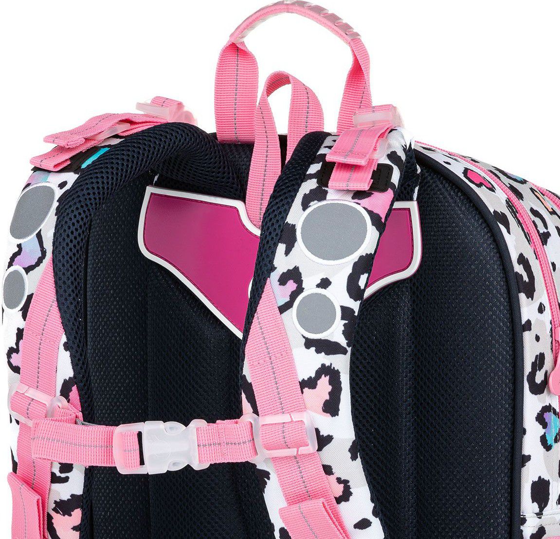 Batoh má dvě objemné hlavní komory. Zadní komora je širší – doporučujeme k zádům dávat nejtěžší učebnice nebo desky na sešity. Přední komora je o něco užší a je v ní umístěna malá síťová kapsa na zip a jmenovka.