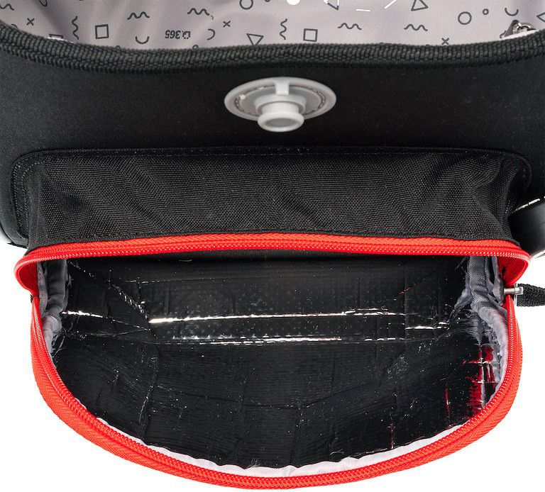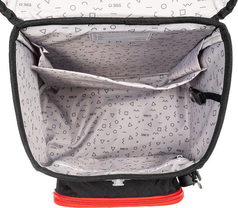 - VNITŘNÍ USPOŘÁDÁNÍ – prostorná hlavní vnitřní komora je rozdělená látkovou přepážkou pro uložení boxu na sešity či knih. Součástí hlavní komory je také kapsička pro uložení drobností, odepínatelný kroužek na klíč a štítek na jméno a adresu. Ve víku je průhledná kapsička na rozvrh hodin