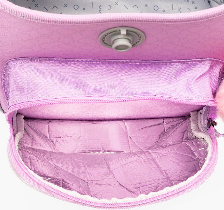 - VNITŘNÍ USPOŘÁDÁNÍ – prostorná hlavní vnitřní komora je rozdělená látkovou přepážkou pro uložení boxu na sešity či knih. Součástí hlavní komory je také kapsička pro uložení drobností, odepínatelný kroužek na klíč a štítek na jméno a adresu. Ve víku je průhledná kapsička na rozvrh hodin