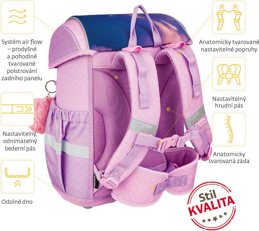 - POHODLÍ – výškově nastavitelný hrudní a nově i odnímatelný bederní pás s kvalitní přezkou zajistí pohodlné usazení aktovky na zádech dítěte i správné rozložení váhy