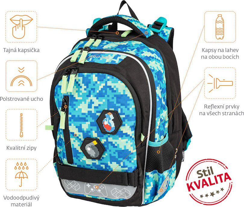 Kvalitní, ergonomicky tvarovaný, odlehčený školní batoh je vybaven reflexními prvky a anatomicky tvarovanými zády s pevnou konstrukcí. Batoh je vhodný pro dítě s výškou 120 - 140 cm.