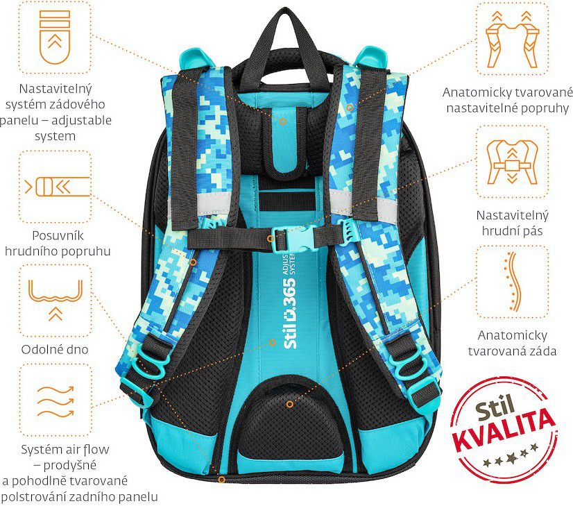 - STIL ADJUSTABLE SYSTEM – nastavitelný systém zad se třemi stupni pro optimální usazení batohu na zádech podle výšky a věku dítěte. Batoh, který roste s dítětem