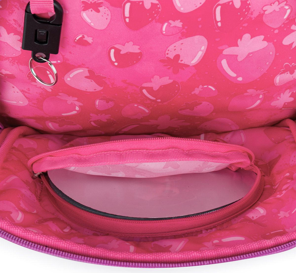 Zadní komora je nejprostornější a doporučujeme do ní ukládat nejtěžší učebnice nebo desky na sešity. Do přední, užší komory se hodí lehčí školní výbava – ideálně penál ve stejném designu nebo box na svačinu. V přední kapse nechybí odnímatelná karabina na klíče. Do boční kapsy pak pohodlně uložíte lahev ZIVA o objemu 0,5 litru.