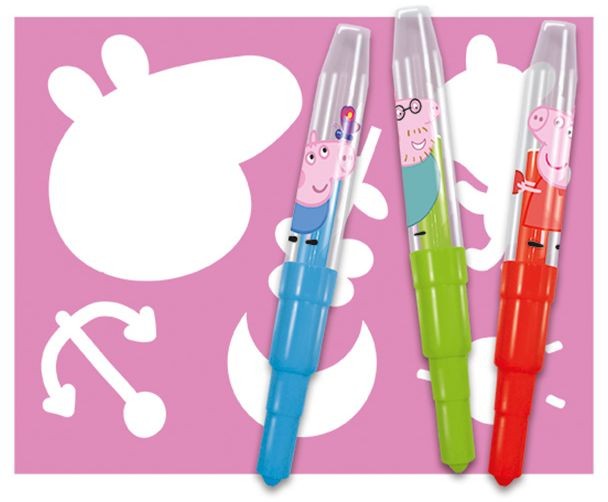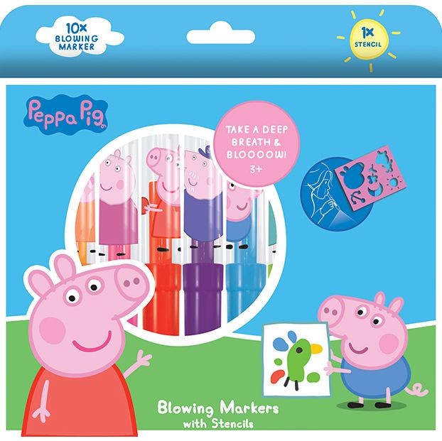Balení obsahuje 10 barevných foukacích fixů s potiskem Prasátka Peppy a 1 šablonku.
