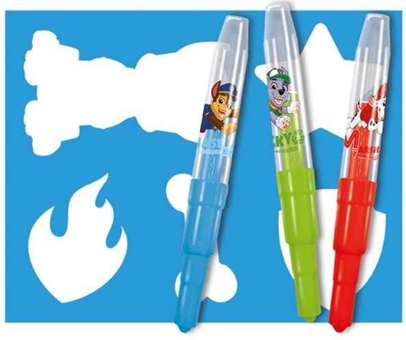 Balení obsahuje 10 barevných foukacích fixů s potiskem v oblíbených motivech Tlapkové patroly a 1 šablonku.