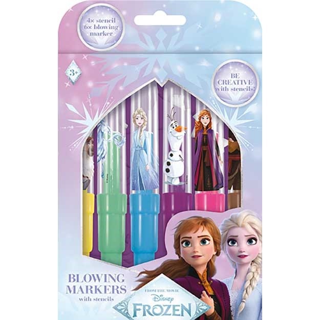 Balení obsahuje 6 barevných foukacích fixů s potiskem a 4 barevné papírové šablonky v oblíbených pohádkových motivech.