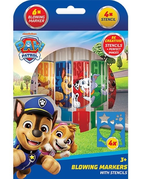 Balení obsahuje: 6 barevných foukacích fixů s potiskem a 4 barevné papírové šablonky v oblíbených pohádkových motivech.