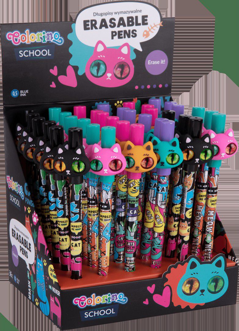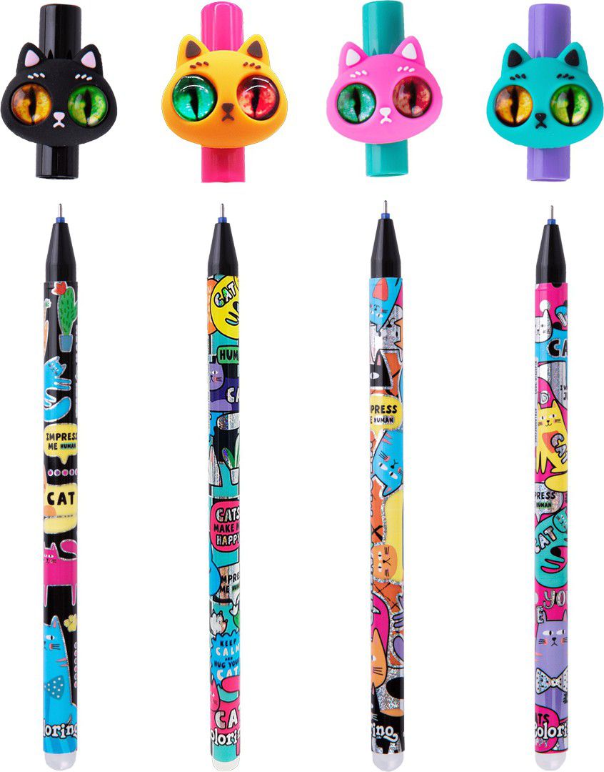 Gumovatelné pero s roztomilým víčkem okaté kočičky.Kombinace veselých a zářivých barev, které se skvěle doplňují s metalickými motivy na těle pera.