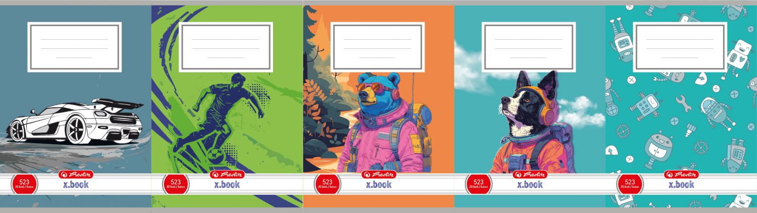 Sešit nabízí motivy robotů, psa, medvěda, fotbalisty nebo auta, které dodávají zápiskům zábavný a dynamický vzhled.