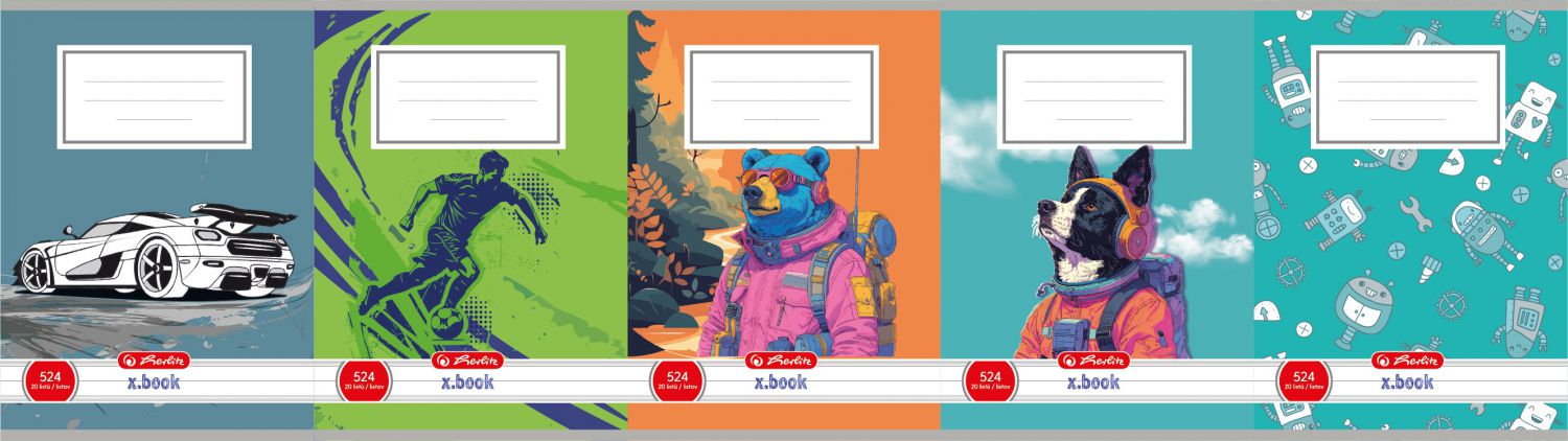 Motivy auta, medvěda, pes, robotů nebo fotbalisty dodávají sešitu dynamiku a hravost.