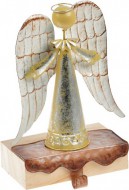 Plechový anděl má stříbrnou barvu a dřevěný podstavec s háčkem.