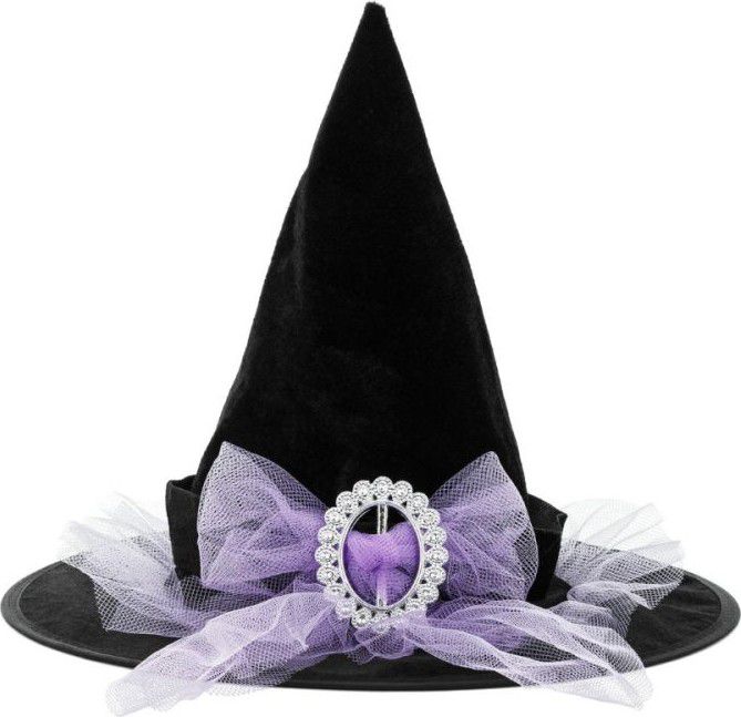 Čarodějnický klobouk s tylovou mašlí ozdobenou stříbrnou sponou.