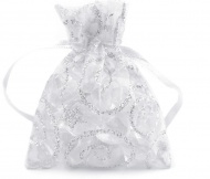 Dárkový pytlíček je vyrobený z organzy a zdobí ho ornamenty z glitrů. Snadno se uzavírá pomocí dvou stahovacích šňůrek.