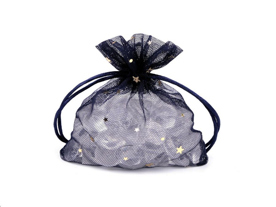 Dárkový pytlíček je vyrobený z tylu. Zdobí jej lesklý metalický potisk hvězdiček. Snadno se uzavírá pomocí dvou stahovacích saténových šňůrek. Do pytlíku skryjete drobné dárky nejen na narozeniny, ale také na Vánoce.