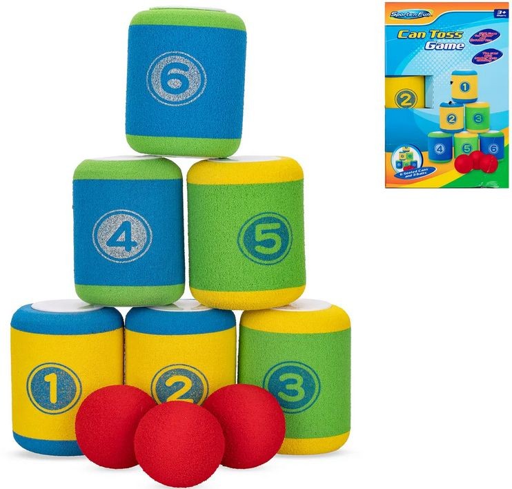 • Souprava obsahuje 6 lehkých plechovek s čísly nebo potiskem a 3 měkké míčky, které jsou bezpečné pro hru v interiéru i exteriéru.