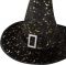 Stylový špičatý čarodějnický klobouk pro dospělé v černé barvě se zlatým potiskem a stříbrnou sponou. Staňte se hvězdou karnevalového nebo halloweenského večírku díky tomuto nepřehlédnutelnému klobouku!