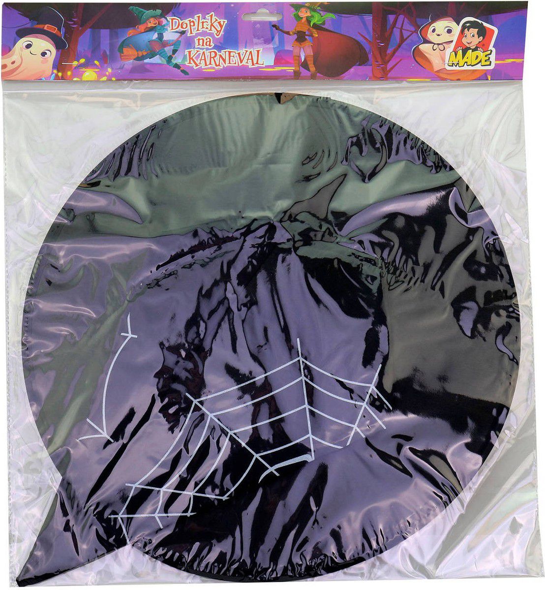 Špičatý černý klobouk pro čarodějnice a čaroděje. Bílý potisk pavučina s pavoukem, doplněk ke kostýmu Čarodějnice, na karneval.