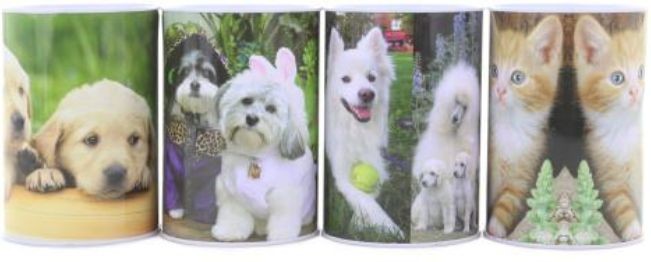 Plechová pokladnička s motivem pejsků a kočiček o velikosti cca 12 x 8,5 cm.