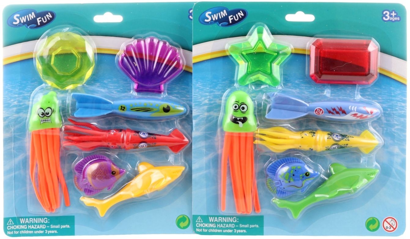 Sada na potápění obsahuje 1x chobotničku, 1x raketu, 1x žraloka, 1x rybku, 1x medůzu a 2x diamant.