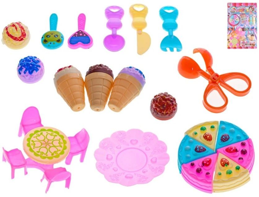Malá sada cukrářský set obsahuje stoleček, židličky pro panenky a cukrářské dobroty.