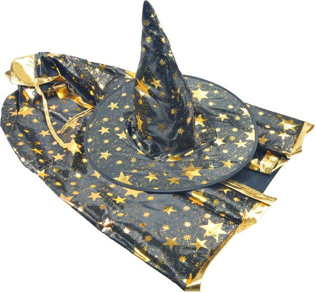Čarodějnický set plášť + klobouk. Čarodějnický plášť i klobouk je se zlatými hvězdami. Tento set využijete jako kostým černokněžníka či kouzelníka. V černozlaté kombinaci barev budete nepřehlédnutelní. Je z lehké látky a váže se pomocí šňůrek. BALENÍ OBSAHUJE: - plášť - klobouk Délka pláště: 60 cm Uvedená cena je za 1 balení.