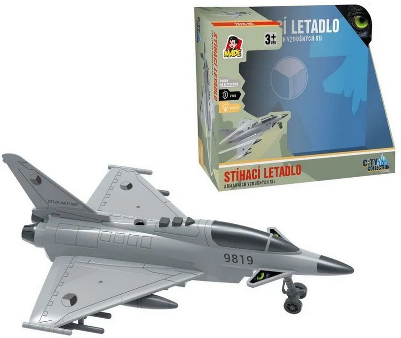 Stíhací letadlo na setrvačník zaujme každého malého pilota svými světelnými a zvukovými efekty.