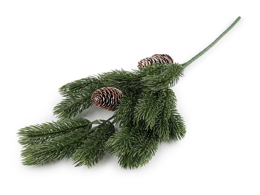 Dekorační větvičku smrku doplňují přírodní šišky. [Jednotlivé větvičky jsou ke stonku připevněné drátkem.] Smrk vynikne ve vázách, truhlících nebo na sváteční vánoční tabuli.