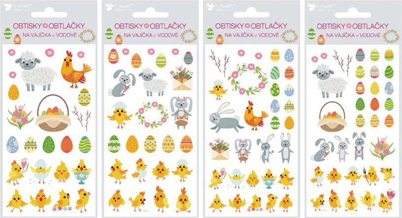 Obtisky na velikonoční vajíčka s klasickými velikonočními motivy jsou krásnou a tradiční technologií zdobení velikonočních vajíček. NÁVOD: Obtisk ponořte na několik vteřin do teplé vody, vyjměte a položte tiskem nahoru na hladkou desku. Jakmile jde obtiskem posouvat, přiložte papír s obtiskem na vařené vajíčko (i obarvené) obrázkem nahoru, papír zpod obtisku vytáhněte a hlazením hladkoou stranou mokrého papíru vymáčkněte vodu a vzduchové bubliny. Pro docílení lesku potřete vajíčka tukem. Dodáváme v mixu po 4 ks dle skladové zásoby. Cena je za 1 ks aršíku.