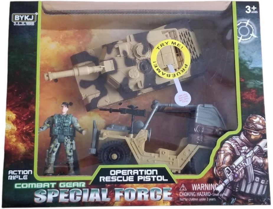 Plastová vojenská sada obsahuje terénní auto, tank (jezdí a vydává zvuky - napájení na 3 AG13 baterie, které jsou součástí balení) a vojáčka.
