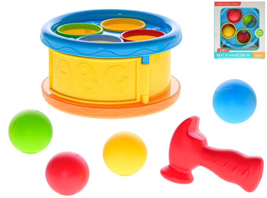 Z jedné strany zatloukačka s kladívkem pro děti a ze strany druhé bubínek.