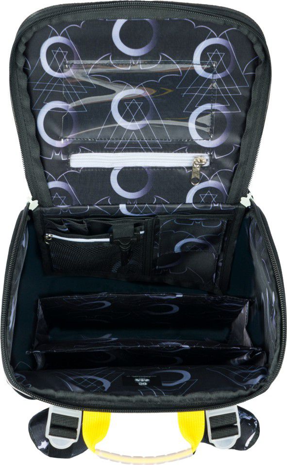 • Uvnitř aktovky je průhledná kapsa na rozvrh a vnitřní organizér umožňující rovnoměrné rozložení hmotnosti, doplněný gumičkou pro fixaci.
