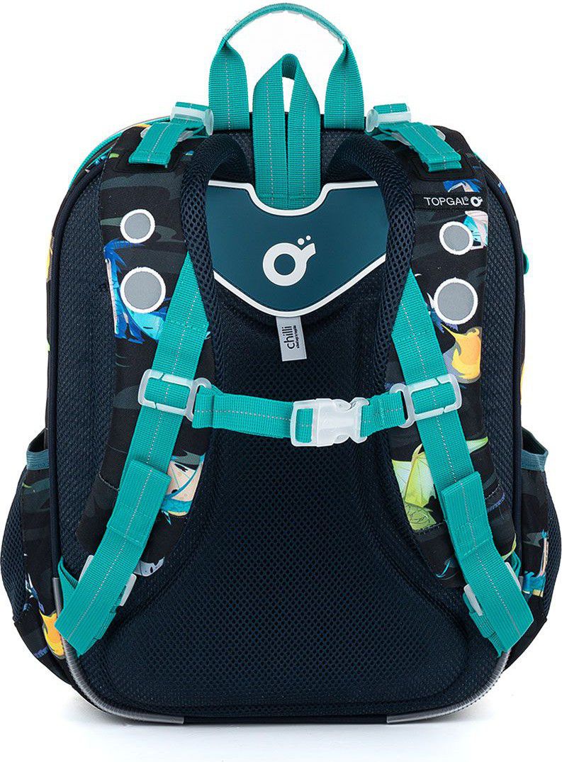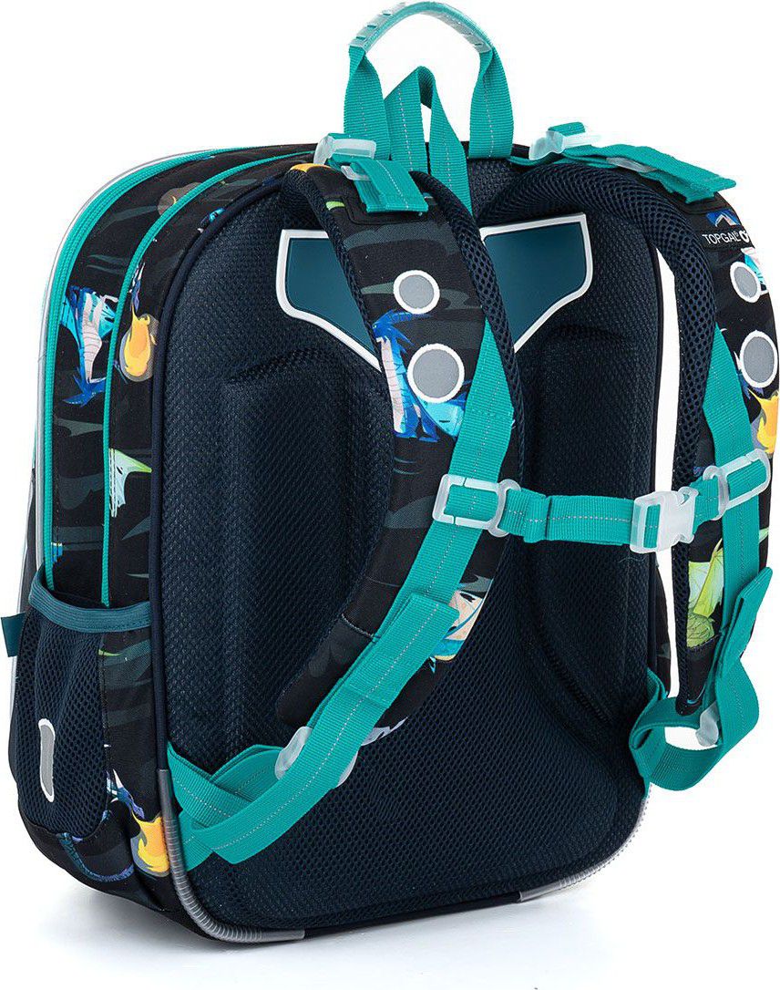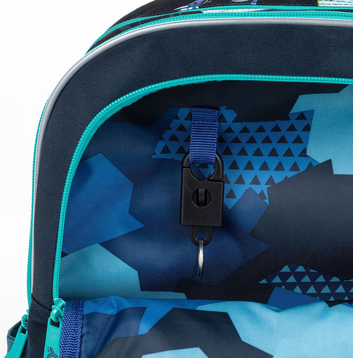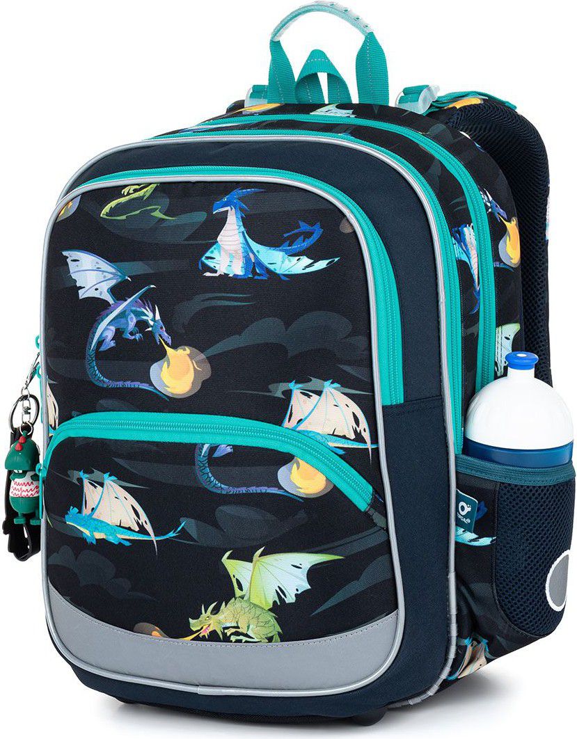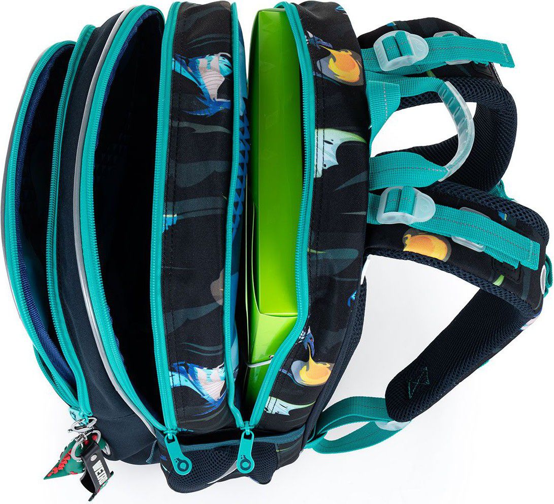 Batoh má dvě hlavní objemné komory. Zadní komora batohu je širší, radíme do ní umístit nejtěžší učivo a směrem dopředu odlehčovat. V přední komoře je umístěna síťová kapsa na zip a jmenovka. Do přední hluboké kapsy na čele batohu se vejde třeba krabička na svačinku, nebo penál ve stejném designu. Do bočních kapes se vejdou lahvičky o objemu 0,5 litru.