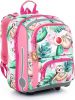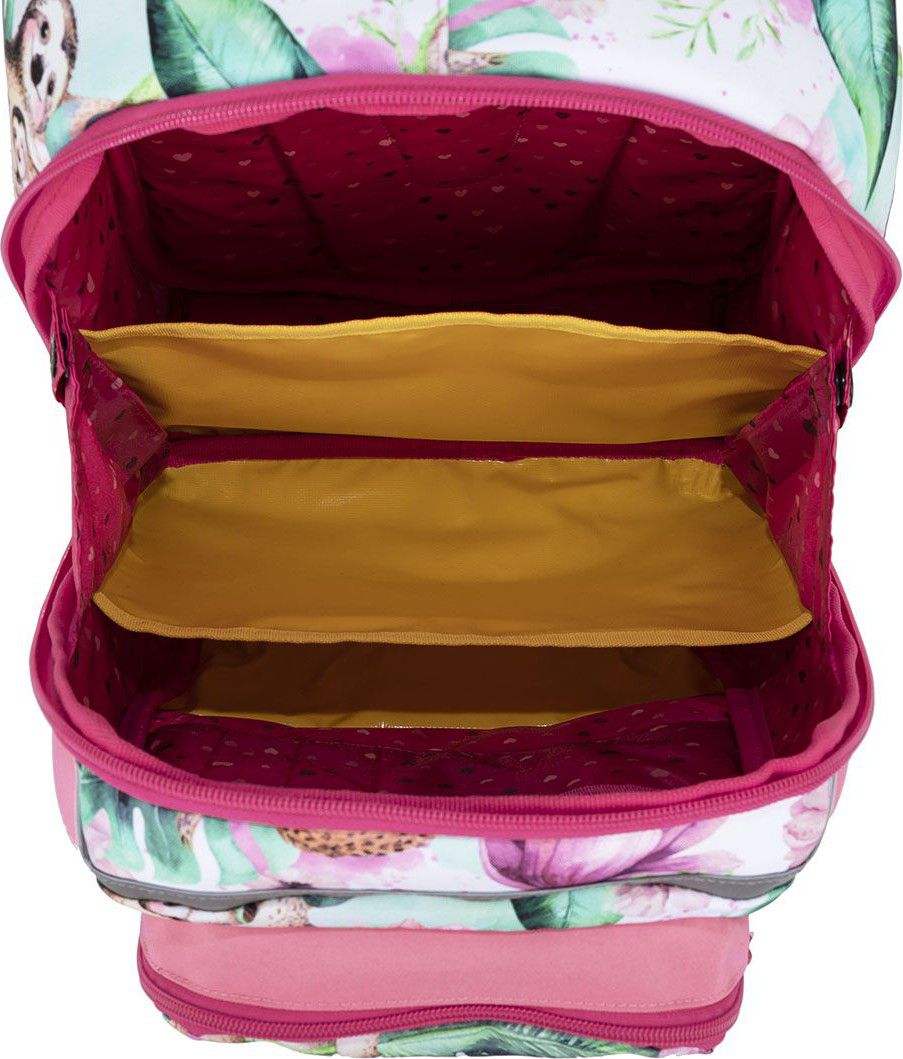 Batoh má jednu velkou komoru se žlutým nepropustným organizérem. Na přední části aktovky najdete další dvě praktické kapsy na zip s blikačkou. Ve vnitřní kapse jmenovku.